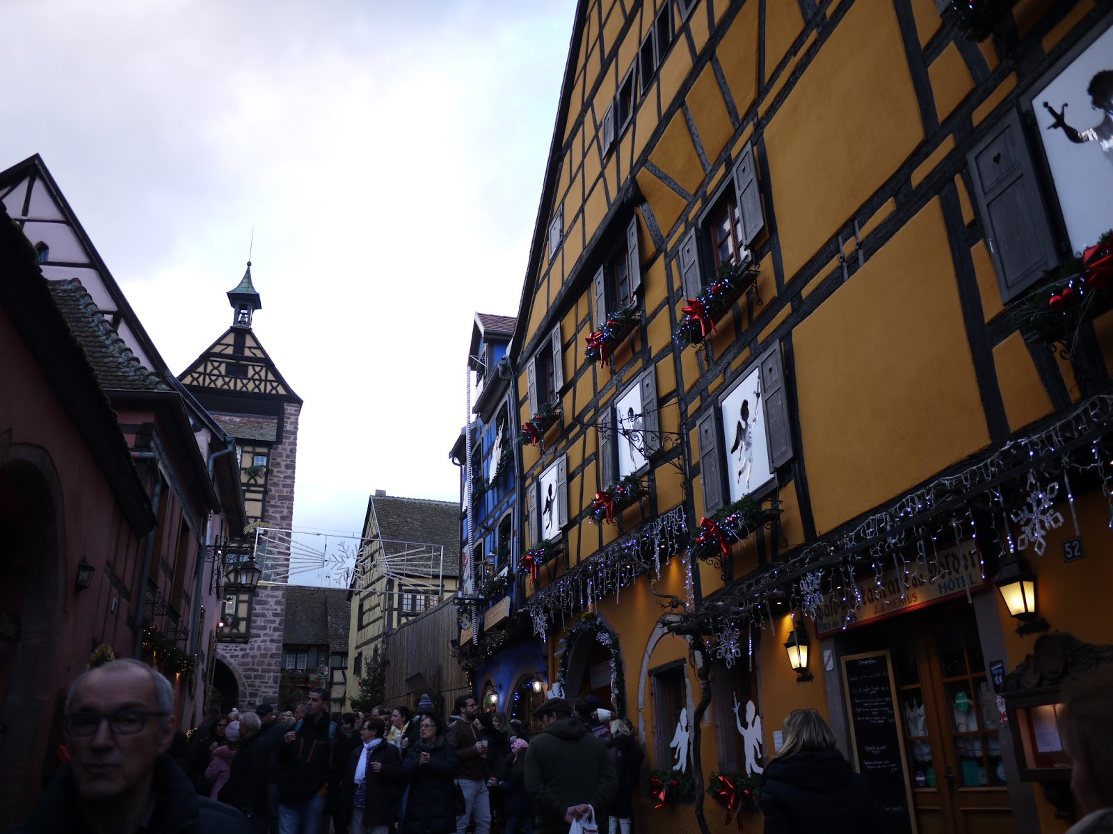 Riquewhir fue la última parada del día. Cuando llegamos también había mucha gente y quizá por eso fue el pueblo que menos nos gustó de todos los que vimos. Aun así allí pudimos disfrutar de la tienda de Navidad más bonita que hemos visto nunca, justo enfrente de la torre principal. Se trata de una tienda de dos pisos, toda llena de decoración navideña espectacular (y algo cara… para qué engañarnos). Suele haber algo de cola para entrar pero merece la pena verla.