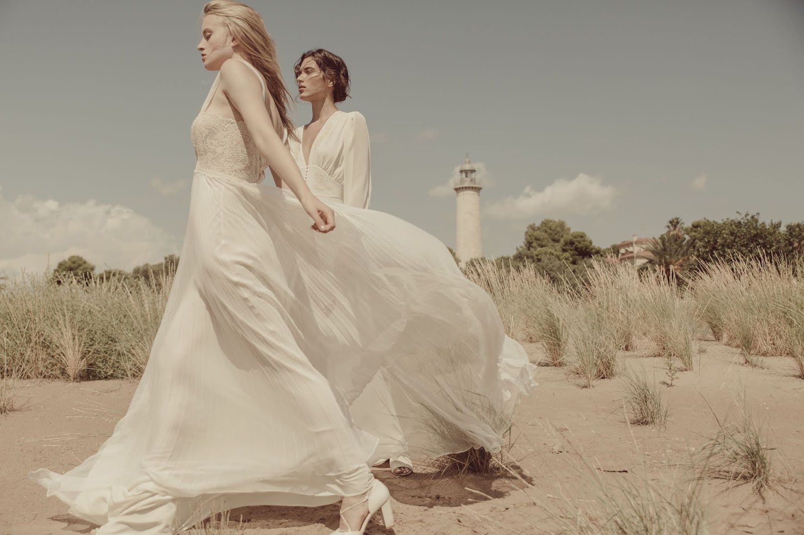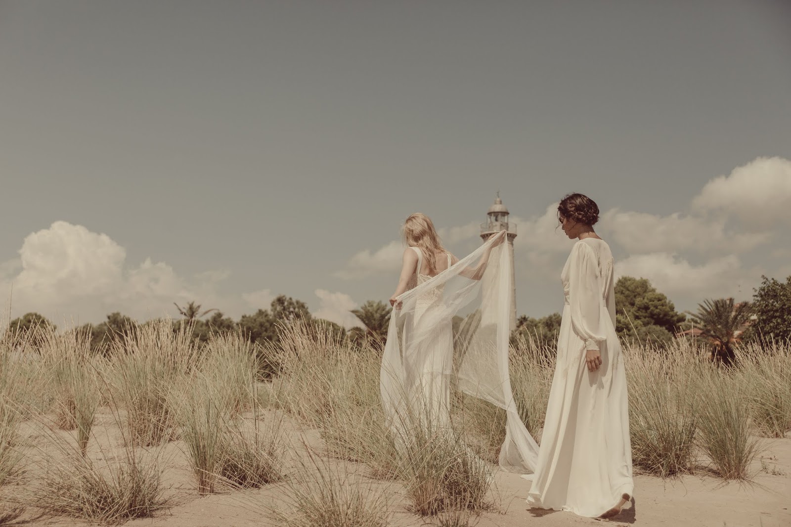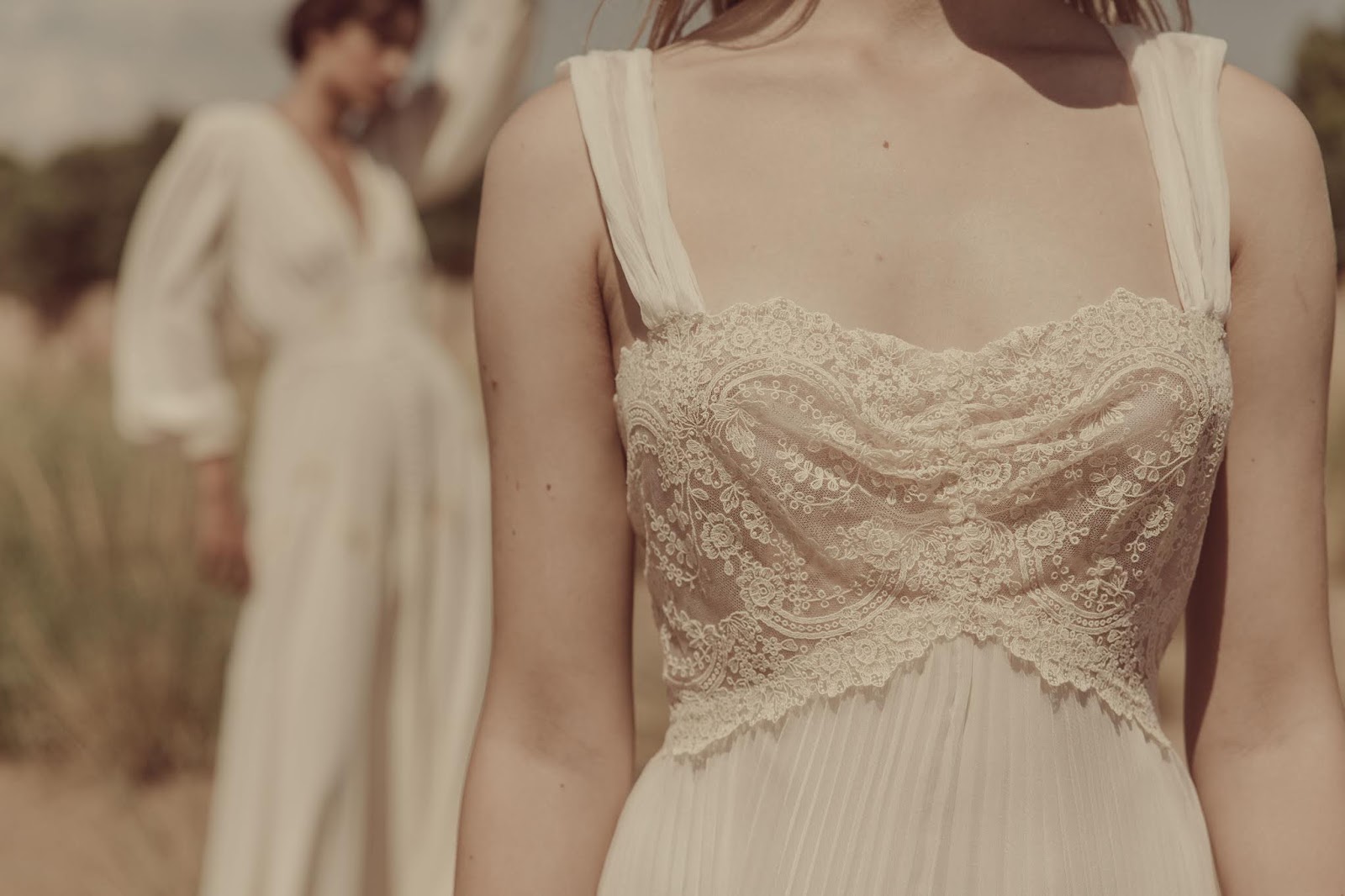 “Los encajes de bolillos son el pilar de Cordelia y el mar, una colección en la que predominan las siluetas vaporosas y etéreas. Tejidos ligeros como la gasa, la muselina, la bambula y el plumetti se han convertido en el lienzo perfecto para incrustar sutilmente dichos encajes: mientras en algunos diseños se busca un efecto lencero, en otros sólo ribetean unos volantes. En esta colección, también se ha trabajado mucho el bordado y los plisados soleil, ambos realizados artesanalmente. La colección rinde homenaje a las manos de todas aquellas mujeres que con la misma soltura pasan de reparar redes de pesca a hacer bolillos en las poblaciones costeras. Cordelia y el mar también es un ejercicio de alta artesanía, una suma de pasión y oficio que impregna todos los vestidos de novia que salen del atelier de Barcelona, situado a dos pasos del mar.”