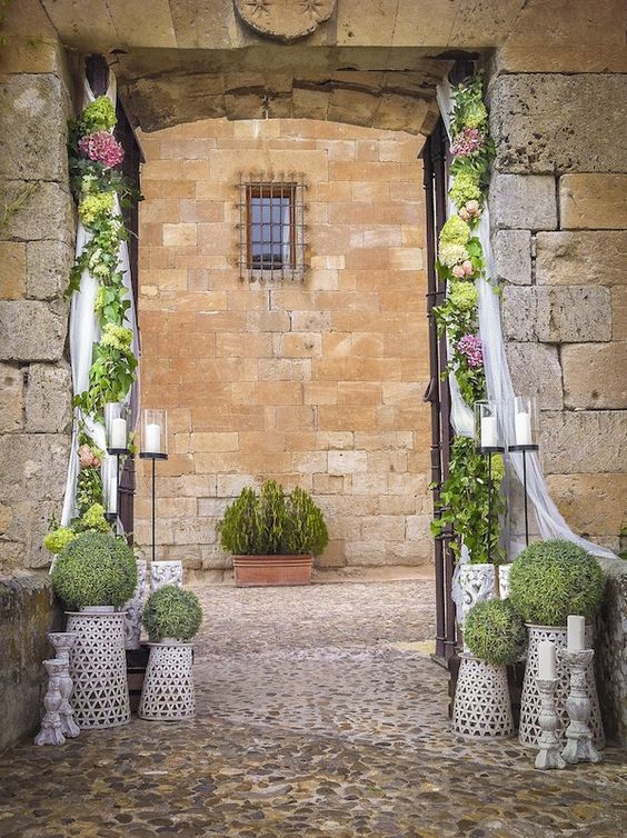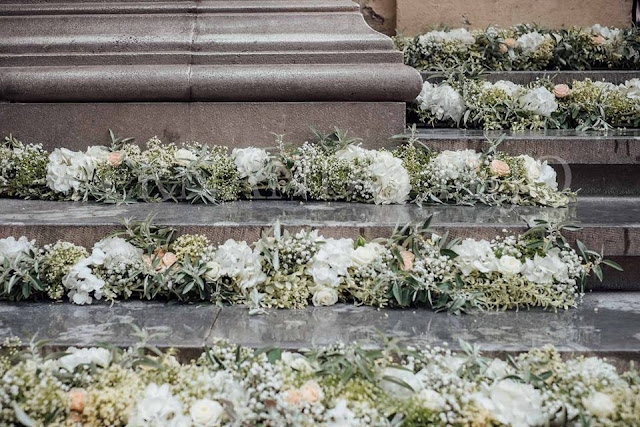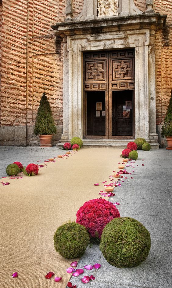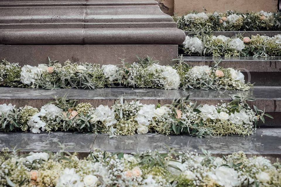 Si vuestra iglesia tiene escaleras a la entrada, otro elemento a introducir es la decoración de los escalones con guirnaldas de flores o con velas o incluso decorar las barandillas de las escaleras.