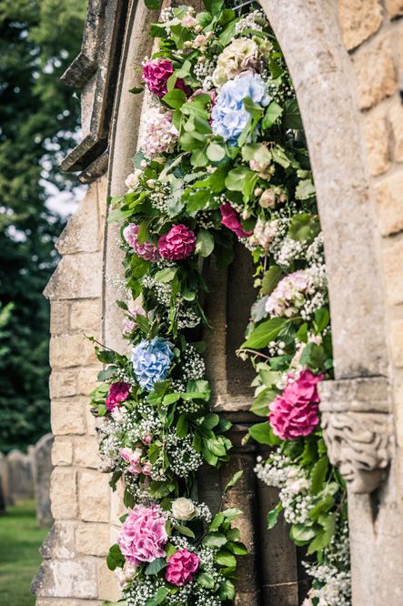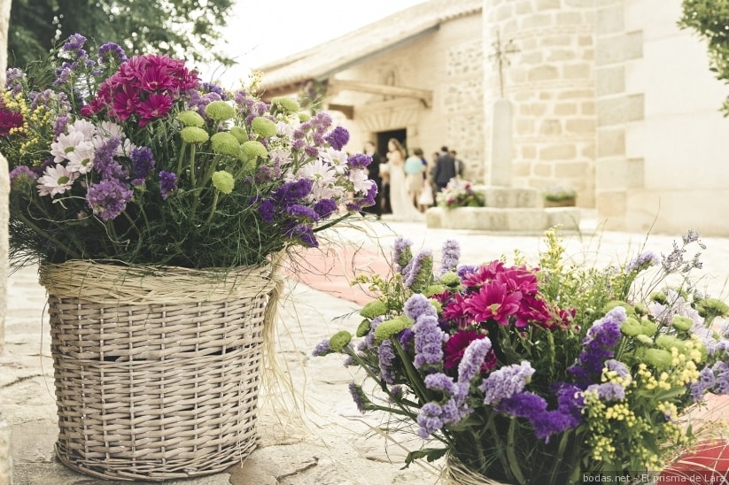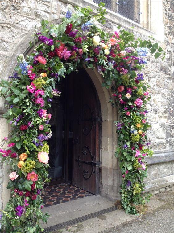 Y aquí mi opción favorita: los arcos! Me gustan de todas las maneras: solo en la parte superior, solo en los laterales o todo el arco completo. Es cierto que son la opción más cara pues supone usar más cantidad de flores y un montaje más elaborado pero el resultado es espectacular. Es una opción muy interesante en pequeñas capillas en las que la puerta no es excesivamente grande, aun así, como ahora veréis en las fotos, el hecho de que vuestra iglesia tenga una puerta grande no es un impedimento para recibir a vuestros invitados con un espectacular arco floral.