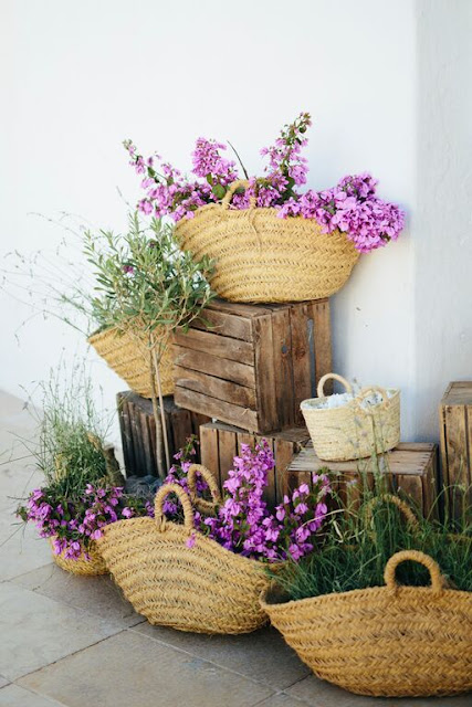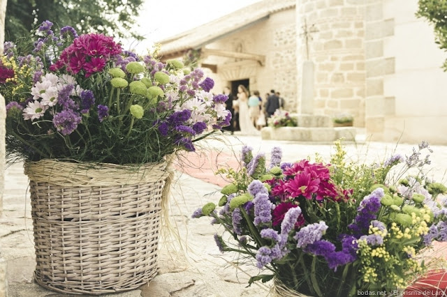 Una opción puede ser los pequeños capazos o macetas de flores donde, dando protagonismo al color verde, podemos aportar toques de color con rosas o lilas y cómo no combinarlo con blanco, el color indiscutible de las bodas. Todo esto puede acompañarse de otros elementos como cajones de manera, velas, escaleras e incluso frutos como los cítricos.