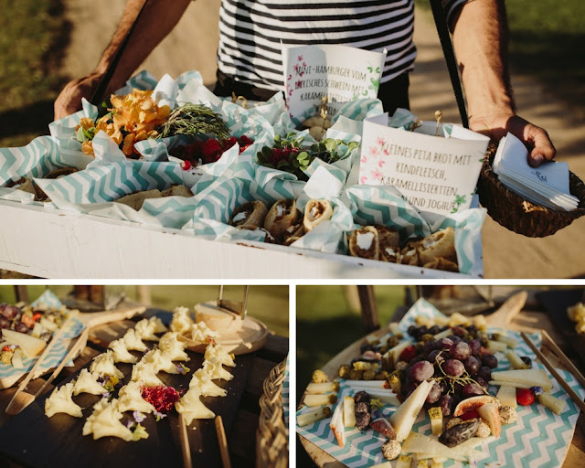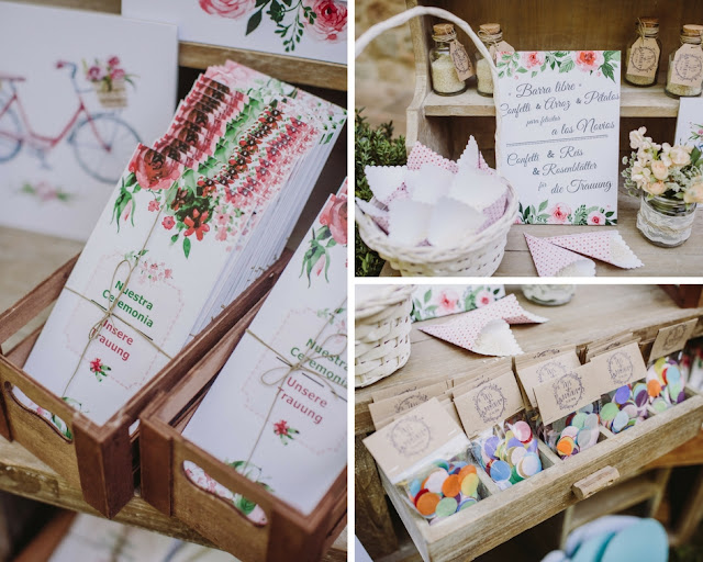 Del ramo de Iris se encargó Lilart Flors. La decoración floral de la ceremonia y el banquete la prepararon en Can Riera. La decoración de las mesas del aperitivo la realizó los propia novios, así como toda la papelería de la boda, los letreros y los sitting plan. Todo estaba escrito en dos idiomas, pues la mitad de los invitados eran alemanes y la otra mitad españoles. También fueron handmade los detalles para los invitados: para los hombres regalaron unas pajaritas que cosió la madre de Iris y para las mujeres Iris hizo unas diademas de flores.