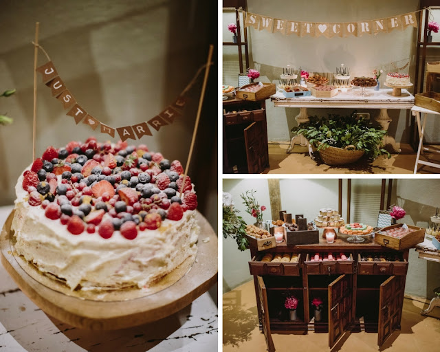 La boda estuvo organizada por Letts Dream quien se encargó de montar todos los rincones especiales: kids corner, mesita con confetis, fotomatón, espacio con fotos de los novios con los invitados. No tuvieron candy bar como tal, sustituyeron el postre tradicional por buffet de dulces donde cada invitado podía coger lo que le apetecía.