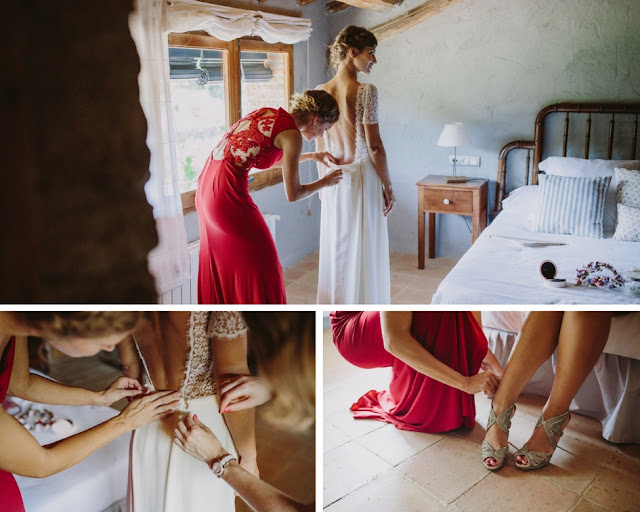 Iris vistió de Laure de Sagazan un sencillo vestido con espalda descubierta muy acorde al estilo de la boda. Lo combinó con un colorido tocado de Le Toquet y unos zapatos Jimmy Choo. Del maquillaje se encargó Laia Martin Make Up y de la peluquería Catalina HairStylist. Mientras Iris se arreglaba estuvo acompañada de su hermana, que vistió un vestidazo rojo de Bianca Costura.
