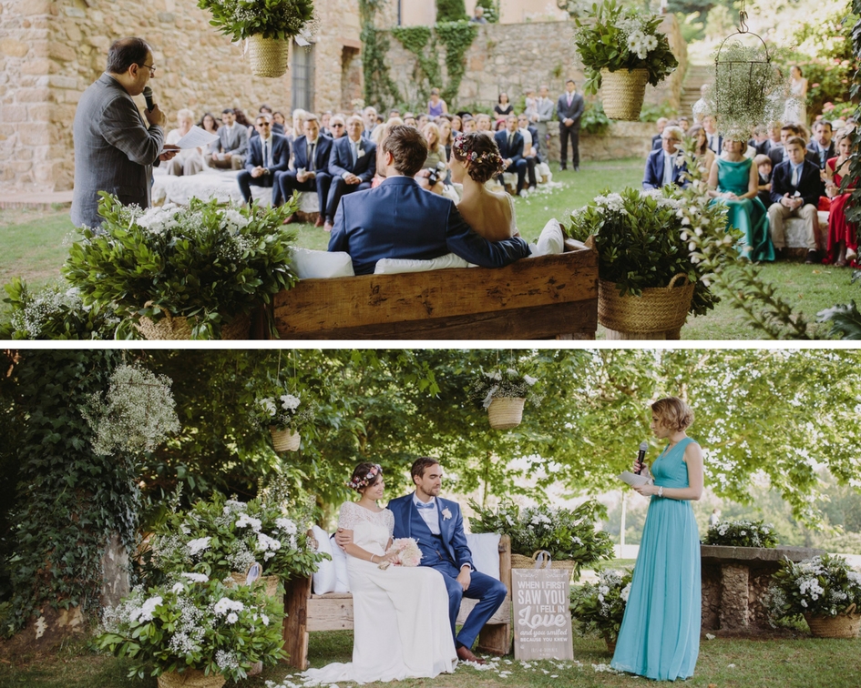 Del ramo de Iris se encargó Lilart Flors. La decoración floral de la ceremonia y el banquete la prepararon en Can Riera. La decoración de las mesas del aperitivo la realizó los propia novios, así como toda la papelería de la boda, los letreros y los sitting plan. Todo estaba escrito en dos idiomas, pues la mitad de los invitados eran alemanes y la otra mitad españoles. También fueron handmade los detalles para los invitados: para los hombres regalaron unas pajaritas que cosió la madre de Iris y para las mujeres Iris hizo unas diademas de flores.