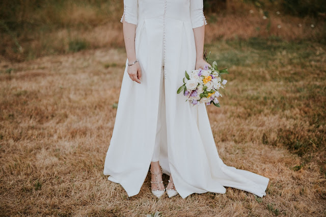 Clara no se considera “la típica novia”, no se veía vestida con encajes ni vestidos con volumen. Es una gran aficionada a la moda y le gusta mucho ojear revistas y webs, guardando todo lo que le inspira. Una vez vio un conjunto de chaqueta y pantalón en color verde y lo guardó, no imaginaba que años después ese conjunto inspiraría el diseño de su vestido de novia. Una modista amiga de la familia materializó el diseño: un pantalón con una levita larga abotonada hasta la cintura. Lo combinó con un precioso tocado de Lucete by Inés. Su ramo fue obra de la tía de Guille.