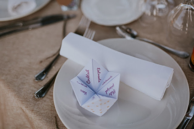 Celebraron una cena bajo las estrellas acompañada de guirnaldas de bombillas que daban un toque muy especial. Toda la papelería de la boda estuvo basada en esas guirnaldas de luces incidiendo en la idea de fiesta o verbena de verano. Las minutas fueron unos “comecocos”, un detalle muy original.