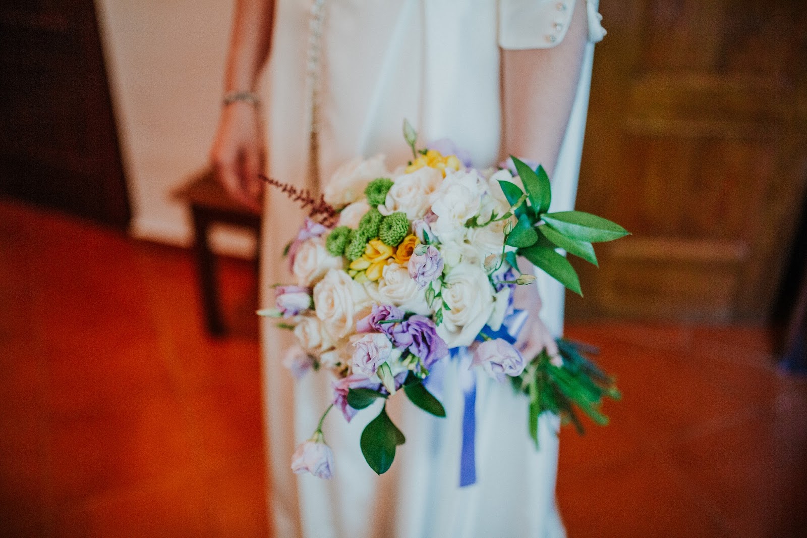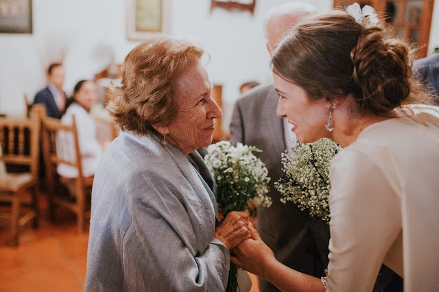 Clara no se considera “la típica novia”, no se veía vestida con encajes ni vestidos con volumen. Es una gran aficionada a la moda y le gusta mucho ojear revistas y webs, guardando todo lo que le inspira. Una vez vio un conjunto de chaqueta y pantalón en color verde y lo guardó, no imaginaba que años después ese conjunto inspiraría el diseño de su vestido de novia. Una modista amiga de la familia materializó el diseño: un pantalón con una levita larga abotonada hasta la cintura. Lo combinó con un precioso tocado de Lucete by Inés. Su ramo fue obra de la tía de Guille.