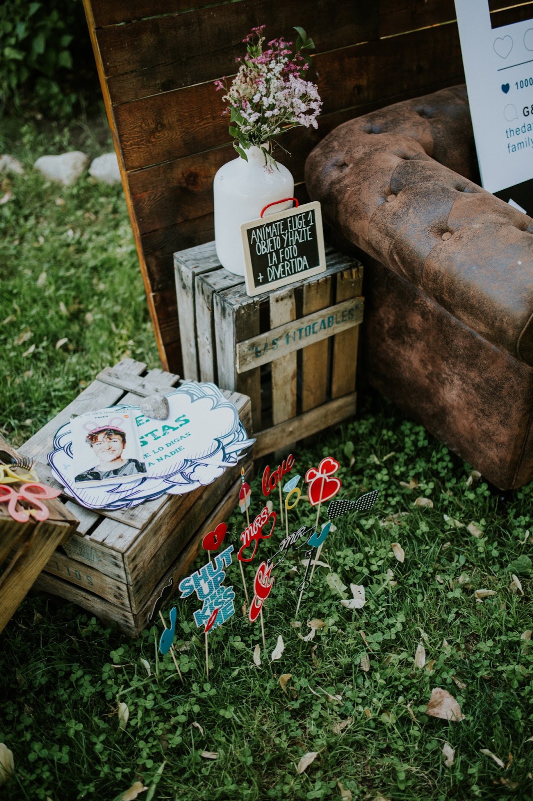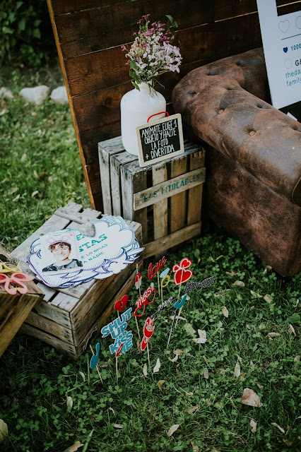 Tuvieron un candy bar muy curioso, no era el típico candy bar con chucherías sino con chocolatinas. Guille trabaja para una conocida marca de chocolatinas así que éstas no pudieron faltar en su boda. En lugar del tradicional photocall tuvieron un marco de fotos a modo Instagram con cámara de fotos instantánea que los invitados podían colgar en unas cuerdecitas.