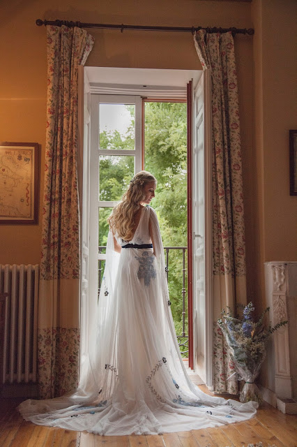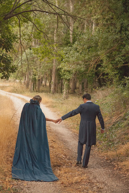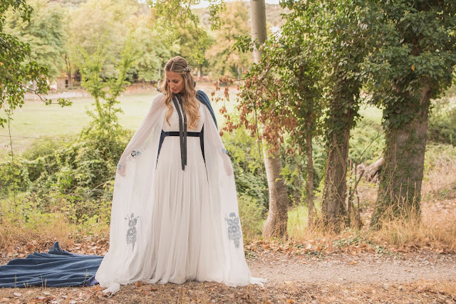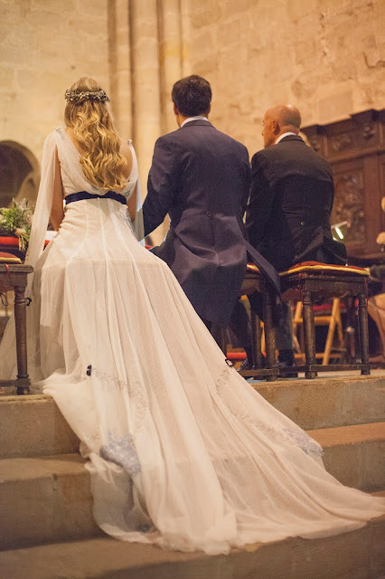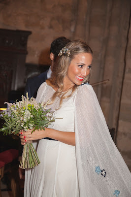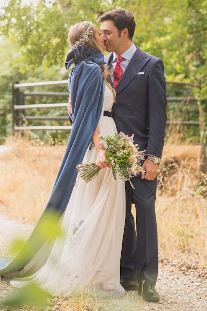 Desde el primer día en que imaginó su boda, Cristina sabía que quería vestir de Helena Mareque. Quería un vestido increíble con un tono de color , sin dudarlo se pusó en sus manos y acertó totalmente. El vestido fue acompañado de una espectacular capa azul.