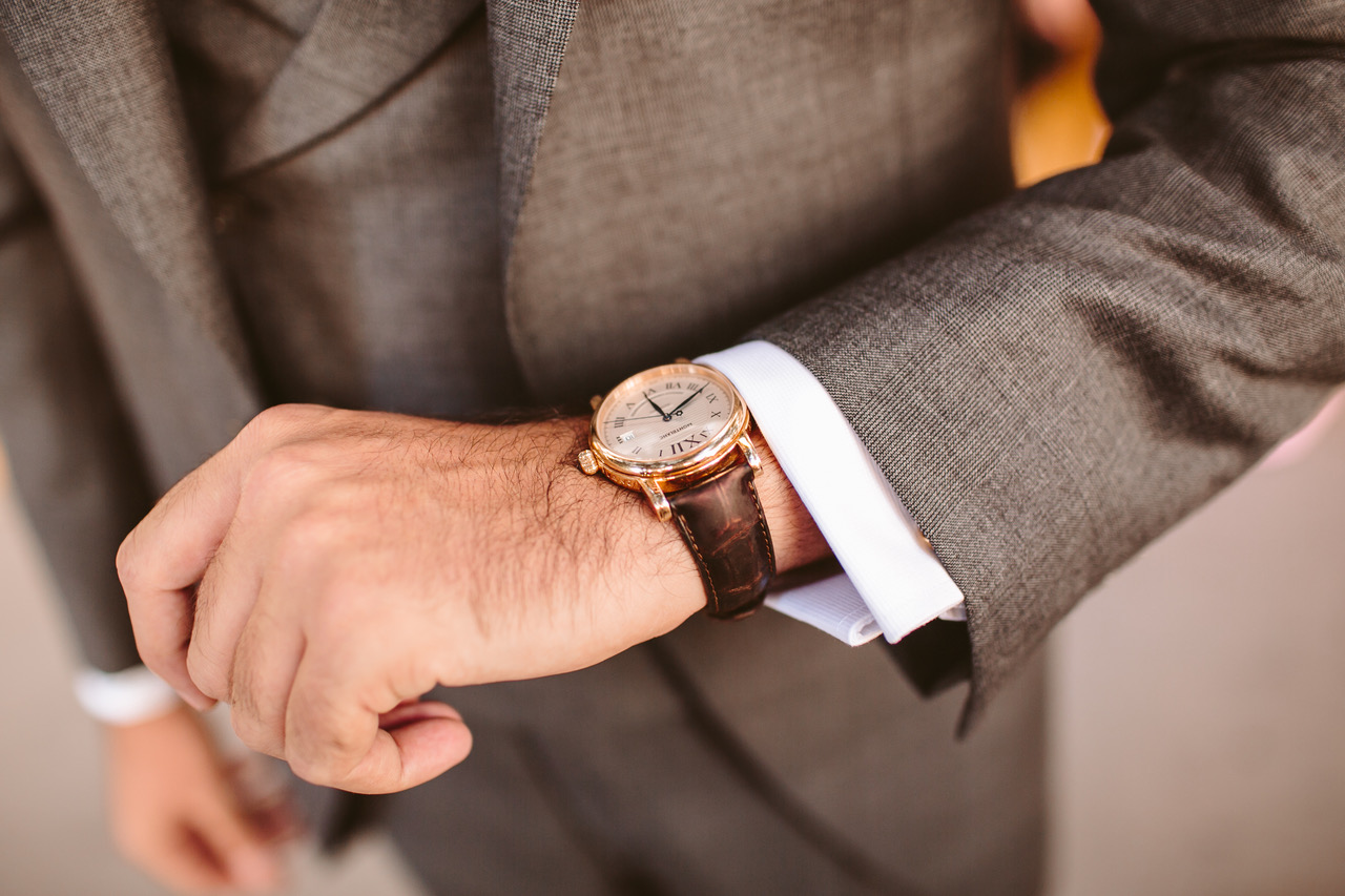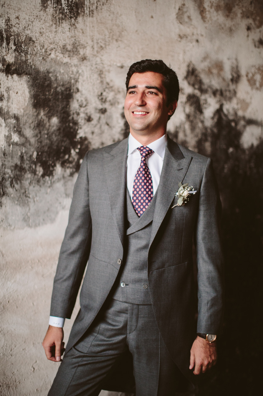 El traje de Manuel fue hecho a medida en Derby. Se trata de un traje gris con una trama muy sutil de cuadros de Gales que acompañó con una corbata azul de Drake’s, unos zapatos de Lottuse y un reloj Montblanc de su abuelo.