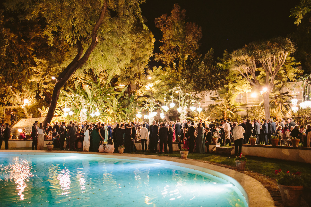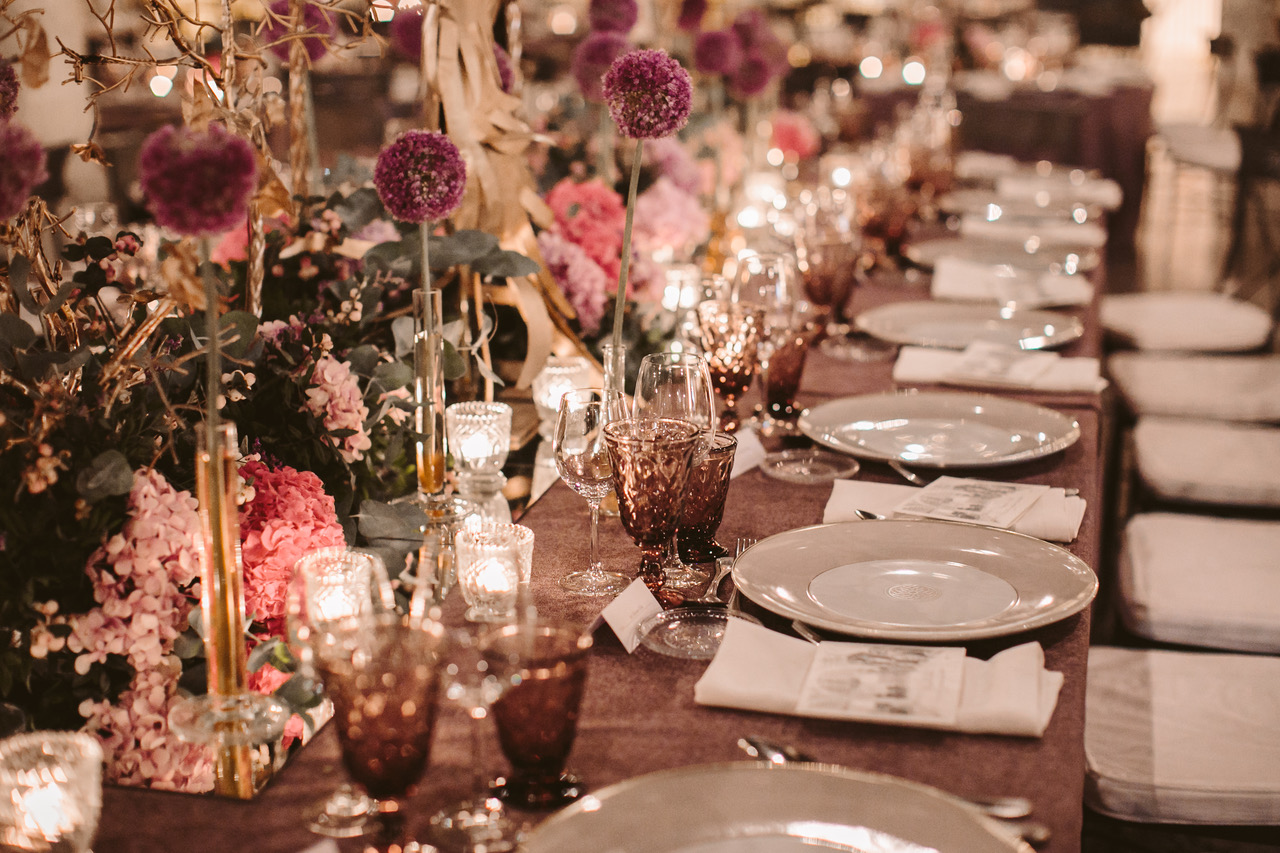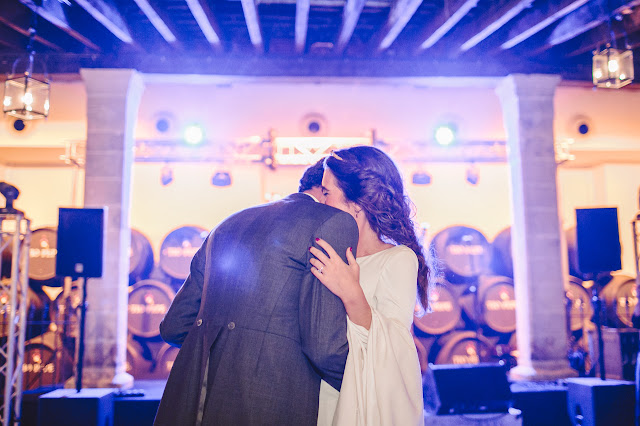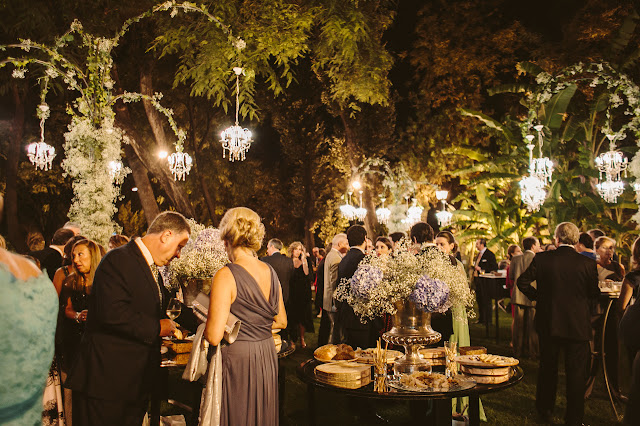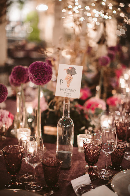 La cena tuvo lugar en las bodegas Gonzalez Byass, en concreto en la bodega de los apóstoles, la más antigua y con más historia. El aperitivo fue en el jardín, el cual contaba con una decoración y una iluminación preciosa. La decoración floral estuvo a cargo de la floristería Enea de Jerez, como podéis ver se trata de una decoración espectacular en tonos morados y dorados a la que no le falta detalle, muy acorde con el lugar.