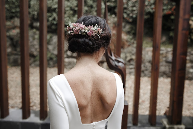 En el pelo se decidió por un recogido bajo muy favorecedor que acompañó con un tocado floral de Fiore Bilbao, que también se encargaron de su ramo y de la decoración floral de la boda.