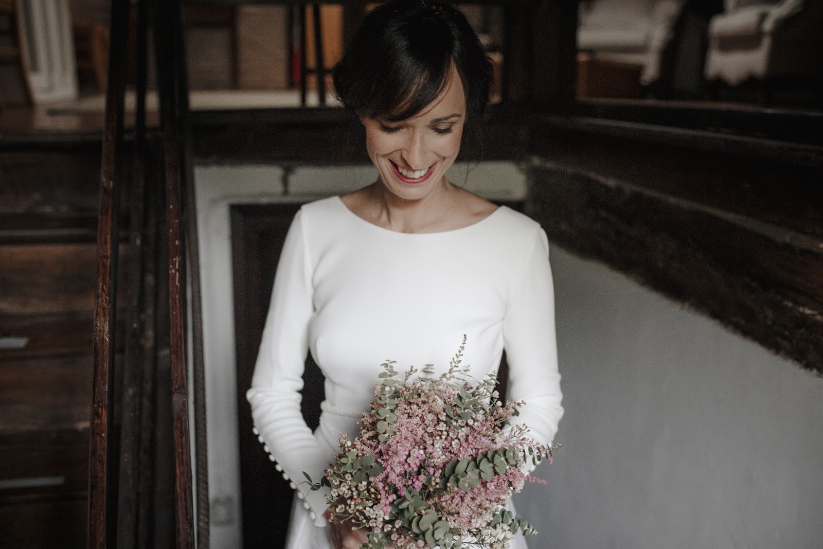 En el pelo se decidió por un recogido bajo muy favorecedor que acompañó con un tocado floral de Fiore Bilbao, que también se encargaron de su ramo y de la decoración floral de la boda.