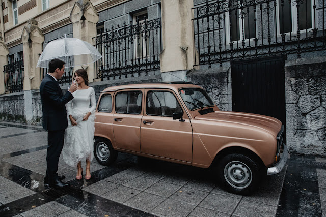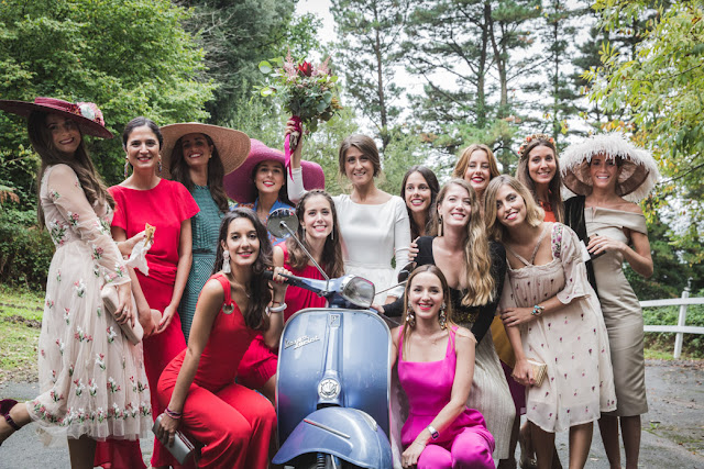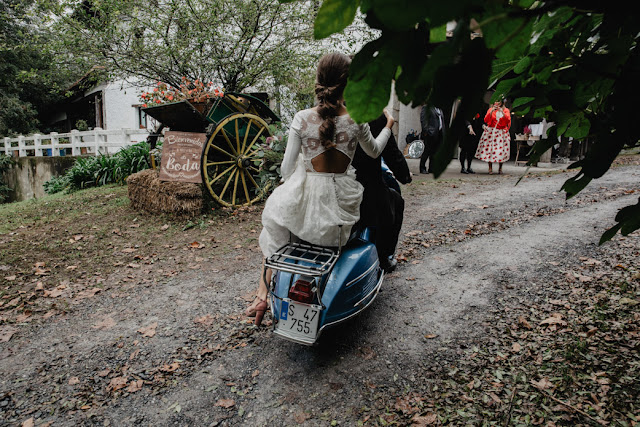 Para el transporte de los novios utilizaron un coche antiguo que alquilaron en Cuatroele. Uno de los momentos más especiales fue cuando Pati entro a la finca con una vespa antigua que perteneció a su abuelo y que le recordaba a sus veranos de la infancia.