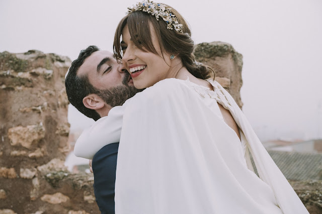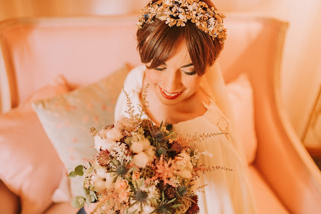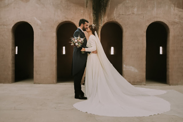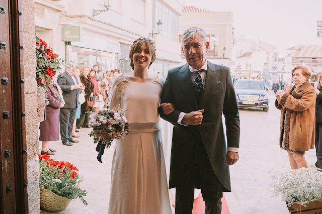 Para su boda Pilar eligió un diseño precioso de Sole Alonso que combinó perfectamente con un tocado de Mimoki y zapatos de Jimmy Choo. De su ramo y de la decoración del resto de la boda se encargó Rosalía de una floristería de Tomelloso. Su ramo era una auténtica joya, con flores silvestres y lazo de terciopelo.