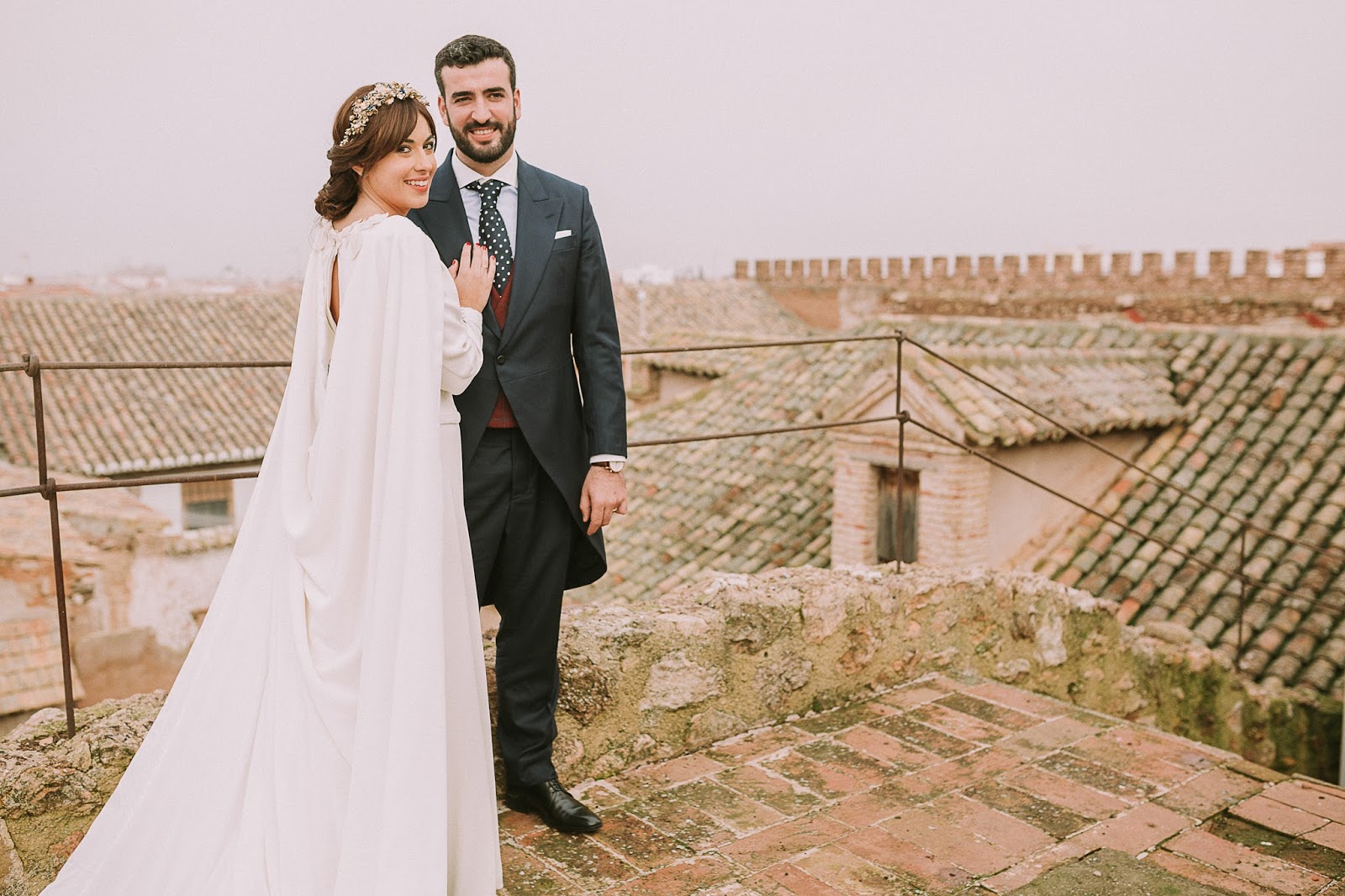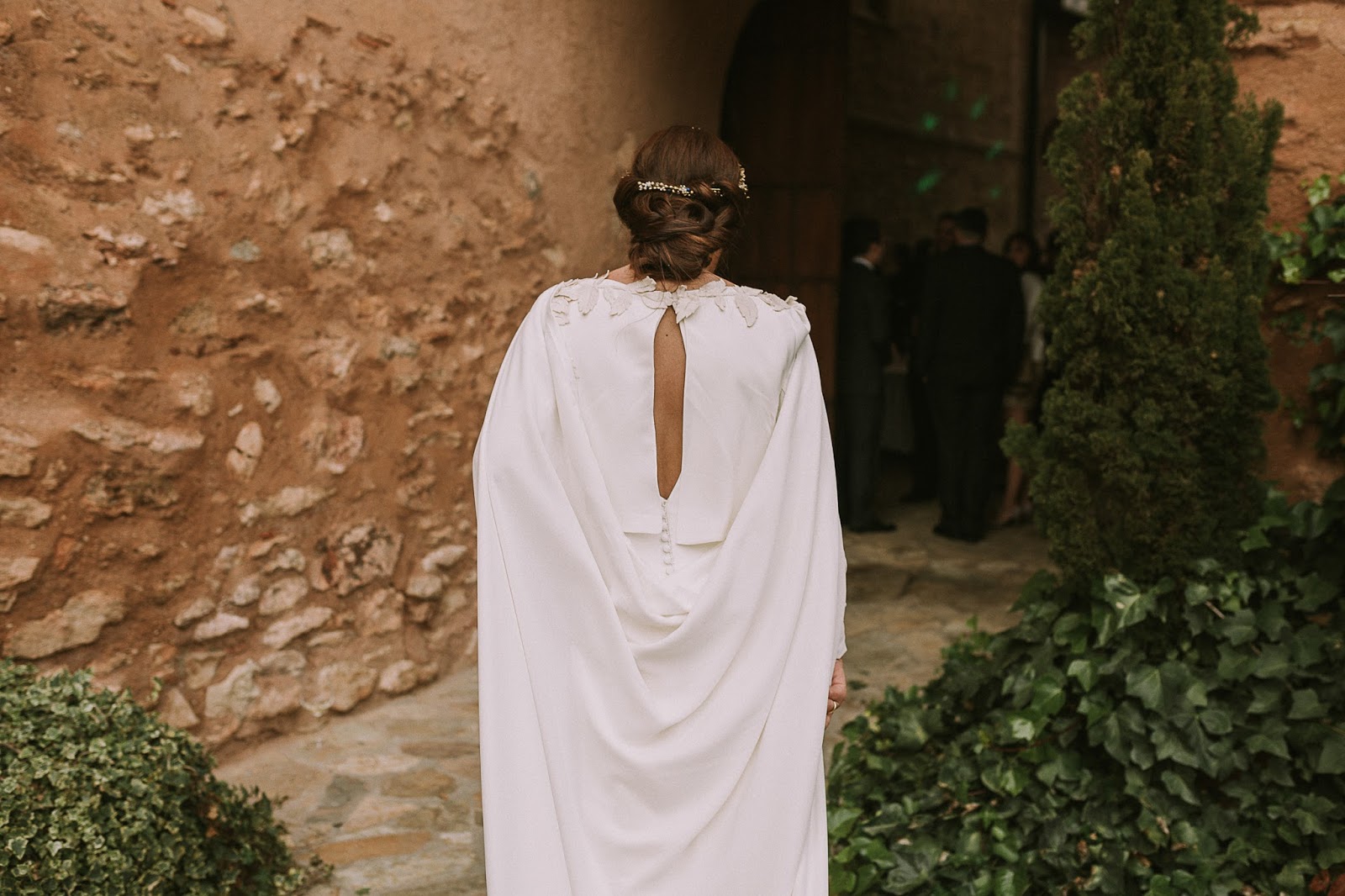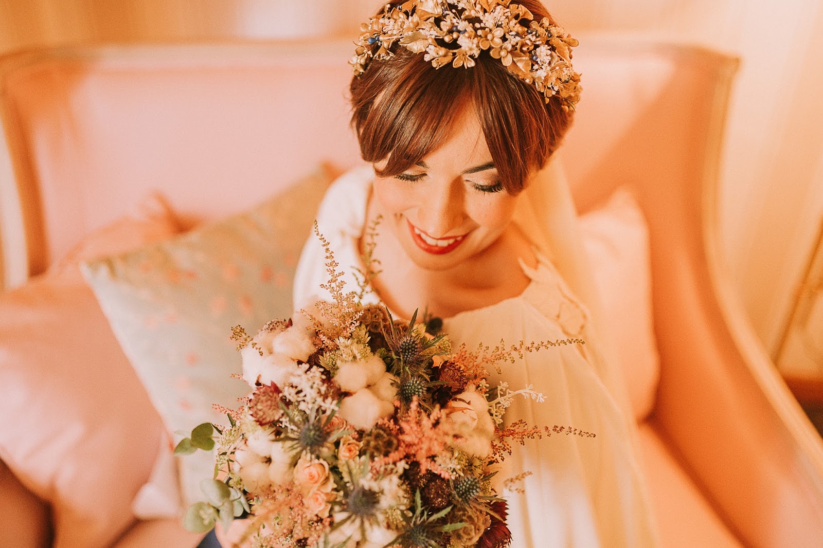Para su boda Pilar eligió un diseño precioso de Sole Alonso que combinó perfectamente con un tocado de Mimoki y zapatos de Jimmy Choo. De su ramo y de la decoración del resto de la boda se encargó Rosalía de una floristería de Tomelloso. Su ramo era una auténtica joya, con flores silvestres y lazo de terciopelo.