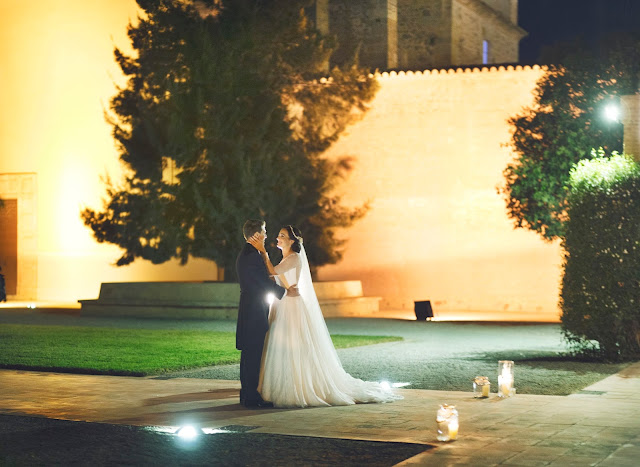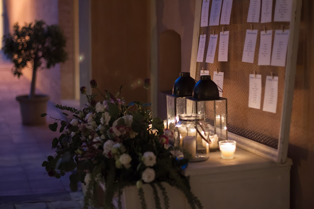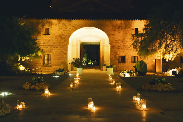 Hizo un dia estupendo y pudieron hacer el coctel al aire libre en un caustro descubierto con guirnaldas de luces y un grupo de musica en directo. Antes de la cena lanzaron un castillo de fuegos artificiales.