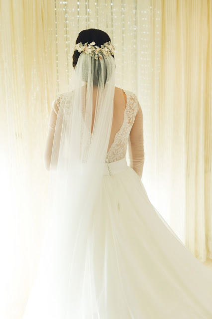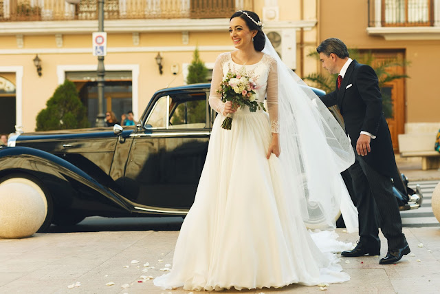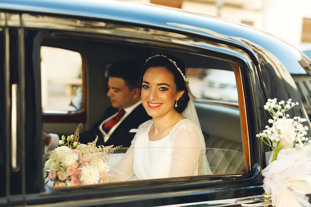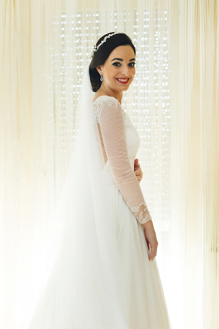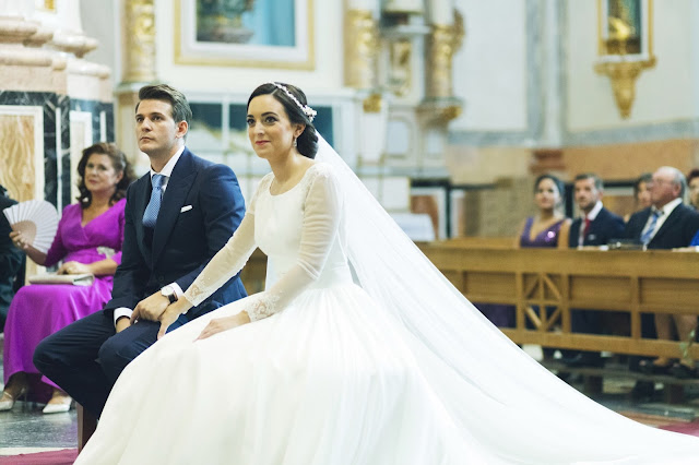 Sandra confió en Luis Rocamora para el diseño de su vestido. Se trató de un vestido romántico con cuerpo en crepe y mangas de tul bordado. Tenía dos faldas, una en gasa de seda con cola de tres metros y medio para la ceremonia y otra en crep más sencilla y cómoda para bailar y disfrutar de la fiesta. Lo acompaño de una corona de porcelana de India Tocados y zapatos de Hannibal Laguna.