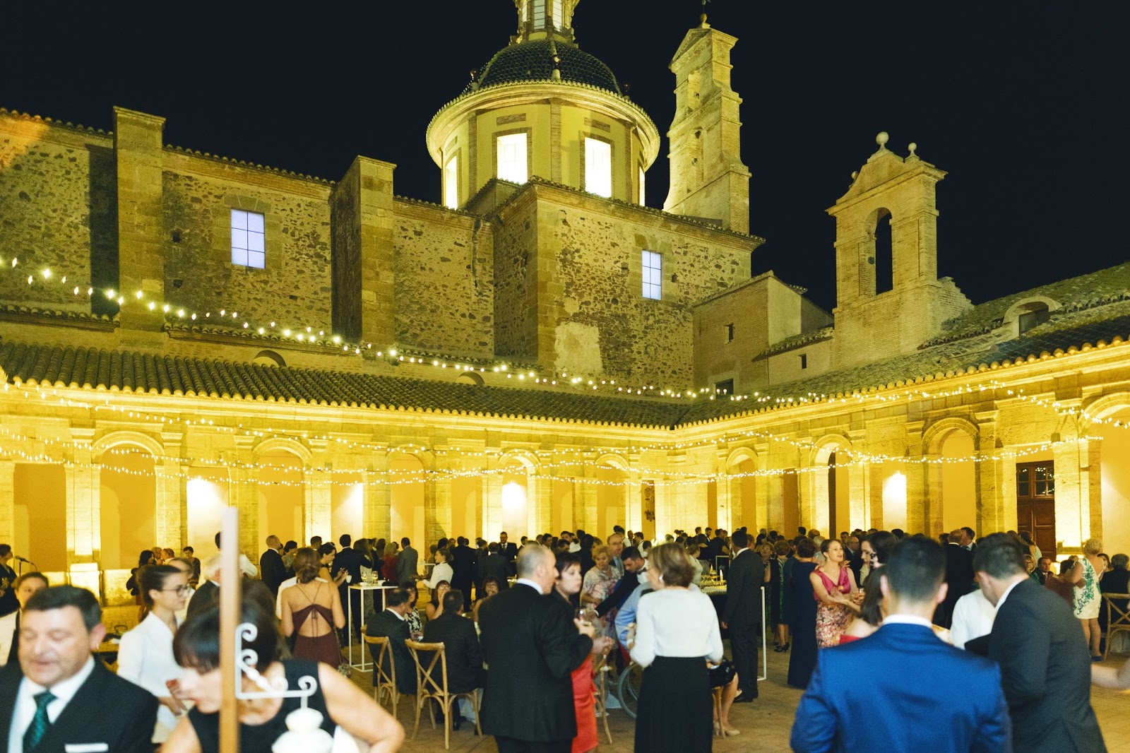 Hizo un dia estupendo y pudieron hacer el coctel al aire libre en un caustro descubierto con guirnaldas de luces y un grupo de musica en directo. Antes de la cena lanzaron un castillo de fuegos artificiales.