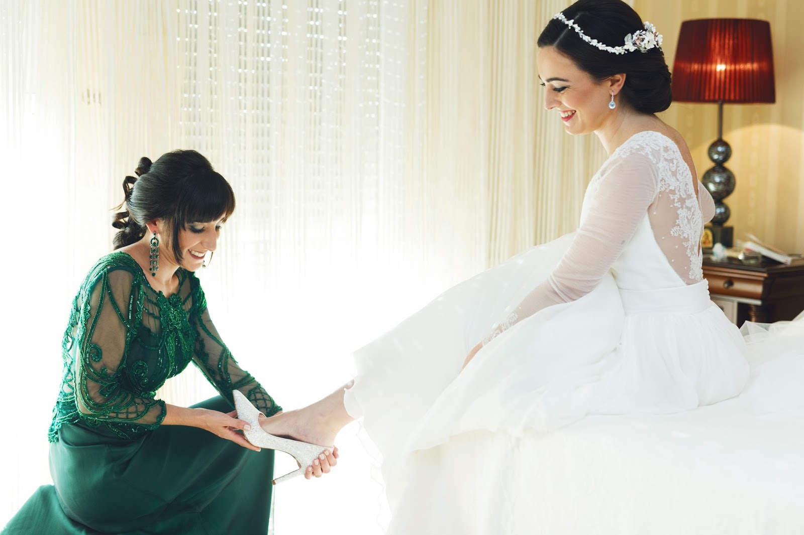Sandra confió en Luis Rocamora para el diseño de su vestido. Se trató de un vestido romántico con cuerpo en crepe y mangas de tul bordado. Tenía dos faldas, una en gasa de seda con cola de tres metros y medio para la ceremonia y otra en crep más sencilla y cómoda para bailar y disfrutar de la fiesta. Lo acompaño de una corona de porcelana de India Tocados y zapatos de Hannibal Laguna.