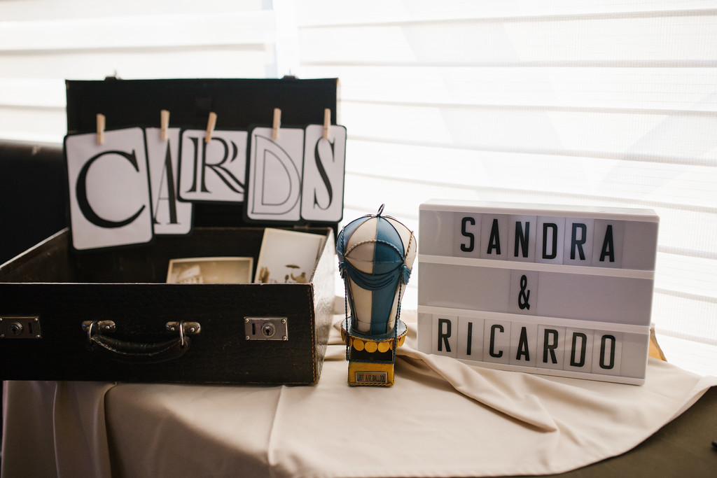 A los novios les encanta viajar, así que la temática de la boda giró en torno a ello. El photocall fue diseño de Ricardo teniendo como protagonista su viaje de luna de miel. Sandra preparó una sorpresa para Ricardo, en una de las maletas que formaba parte de la decoración, colocó fotos de sus viajes.