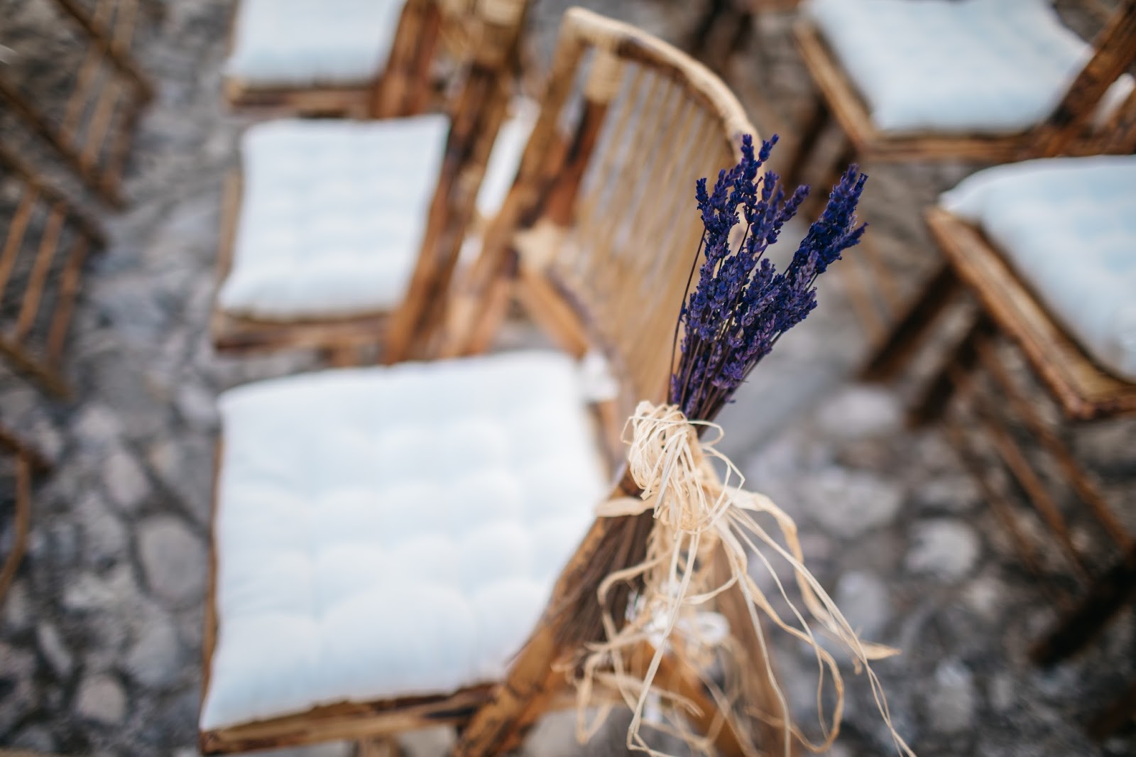 rafia y la madera y una paleta de colores a base de lavanda, rosa palo, blanco y verde.