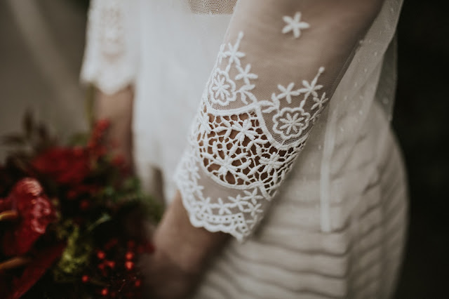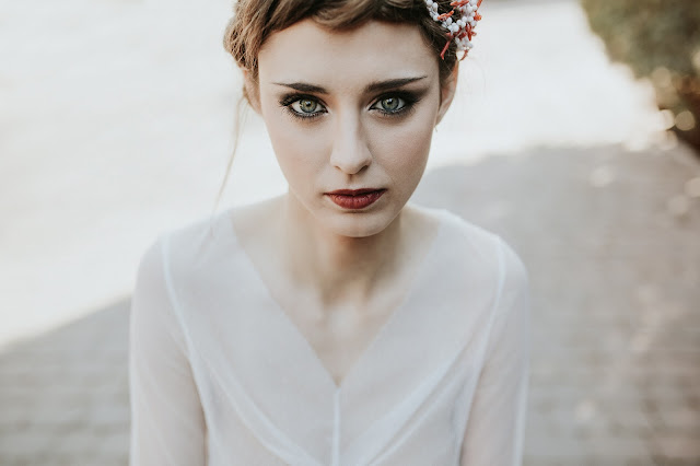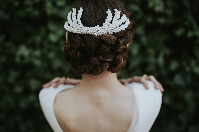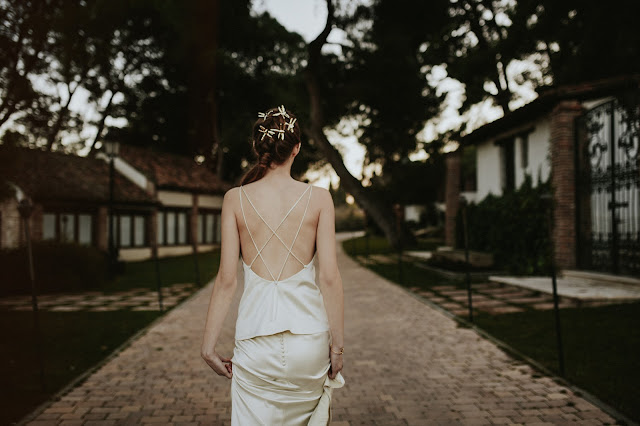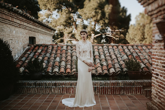 Caminando por los suelos empedrados destacan los zapatos de la firma Doriani, que junto a los tocados refinados y artesanales de Toussete, y a la firma de joyería Casilda Finat visten a una novia Impúribus de máxima sencillez y elegancia”