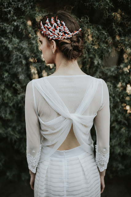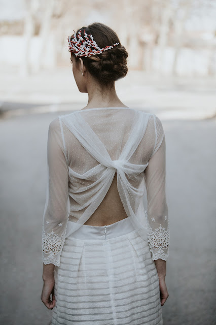 “En el hermoso bosque interior se abre camino el vestido Acies, un traje largo de cuerpo entallado que marca la silueta de la novia hasta la cintura con una base de satén mate en escote corazón. A partir del hombro se deslizan piezas de tul drapeadas en forma de “V” en delantero y espalda estilizando la figura. Es en la zona de la falda donde el vestido Acies potencia la femineidad y delicadeza con tres cascadas de tul con costura exterior de corte diagonal manifestando la exigencia de la costura tradicional más exquisita. En este traje además destaca la versatilidad en el uso del velo. Por un lado aplicándolo cómo cola, sujeto con una abotonadura forrada en la cintura y por otra, la faceta más clásica colocándola en el cabello como velo aportando un toque diferente, a lo largo de la ceremonia.