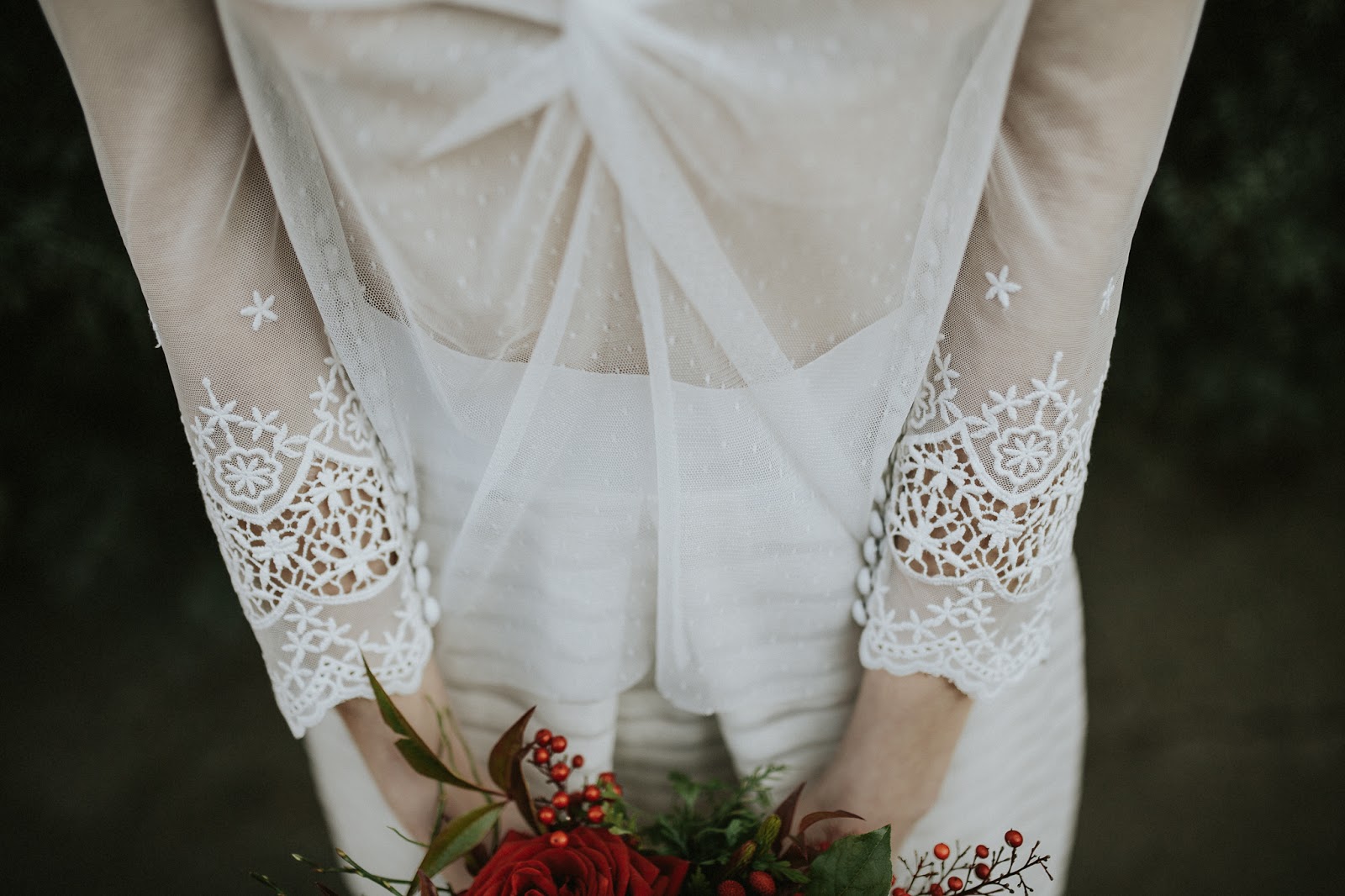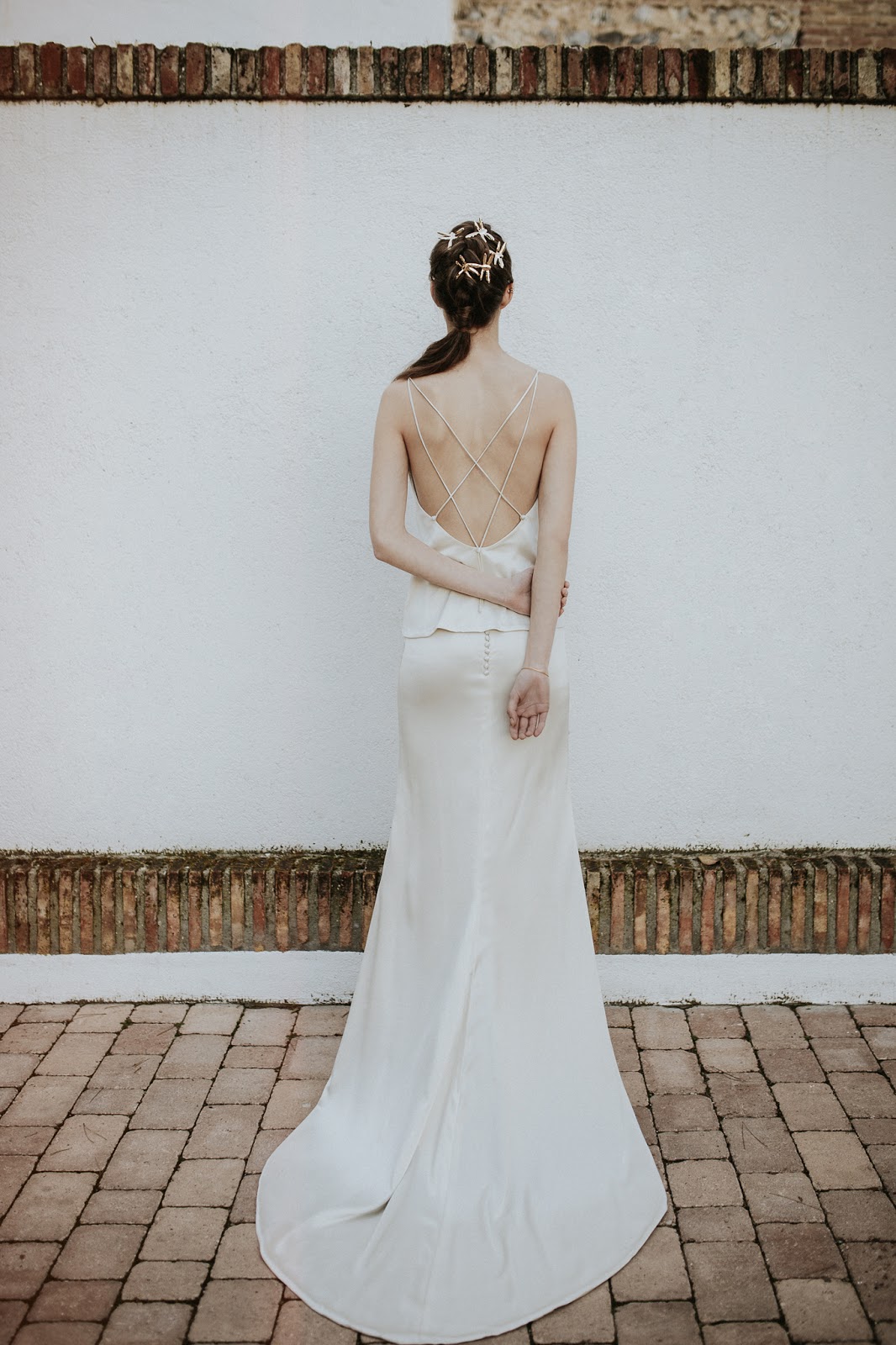 “En el hermoso bosque interior se abre camino el vestido Acies, un traje largo de cuerpo entallado que marca la silueta de la novia hasta la cintura con una base de satén mate en escote corazón. A partir del hombro se deslizan piezas de tul drapeadas en forma de “V” en delantero y espalda estilizando la figura. Es en la zona de la falda donde el vestido Acies potencia la femineidad y delicadeza con tres cascadas de tul con costura exterior de corte diagonal manifestando la exigencia de la costura tradicional más exquisita. En este traje además destaca la versatilidad en el uso del velo. Por un lado aplicándolo cómo cola, sujeto con una abotonadura forrada en la cintura y por otra, la faceta más clásica colocándola en el cabello como velo aportando un toque diferente, a lo largo de la ceremonia.