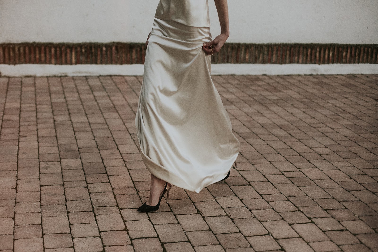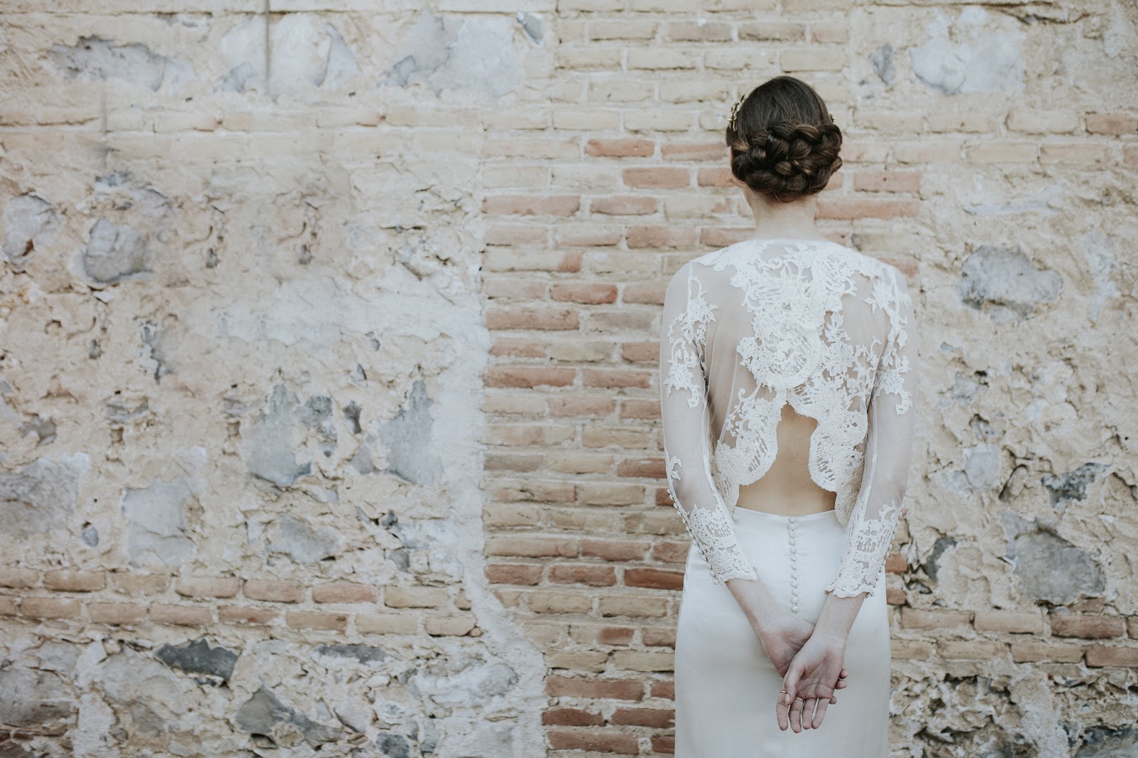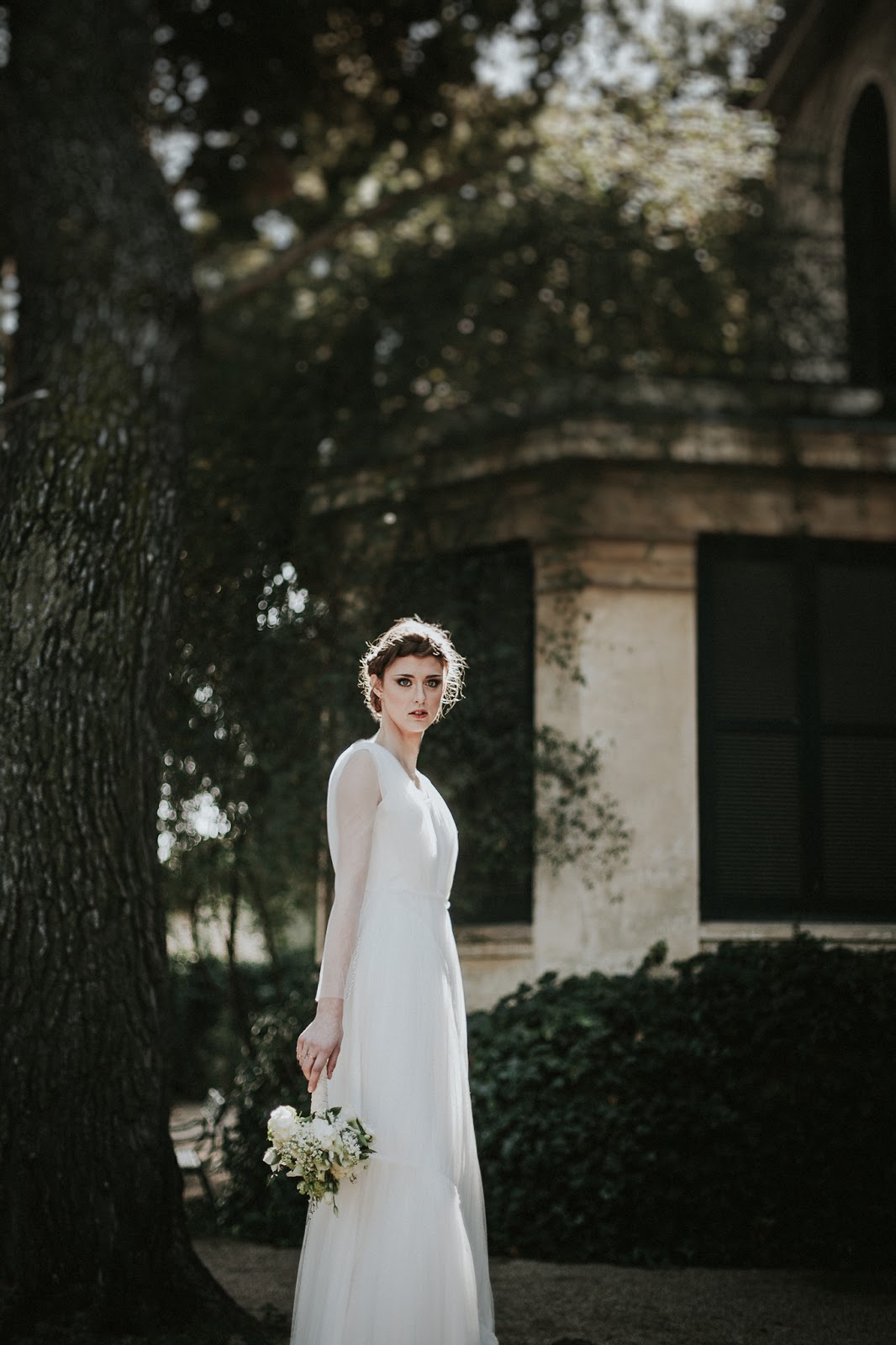 Caminando por los suelos empedrados destacan los zapatos de la firma Doriani, que junto a los tocados refinados y artesanales de Toussete, y a la firma de joyería Casilda Finat visten a una novia Impúribus de máxima sencillez y elegancia”