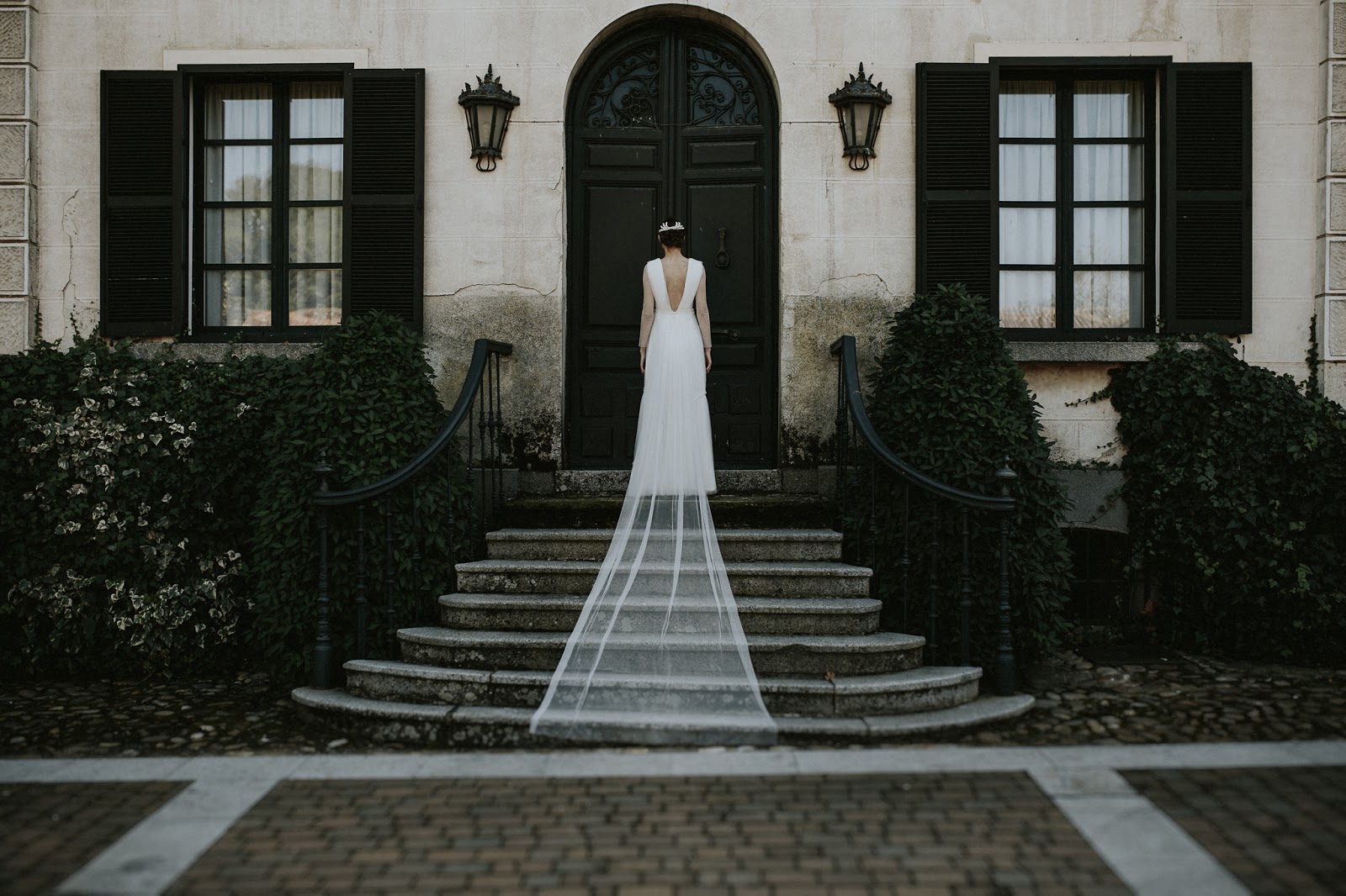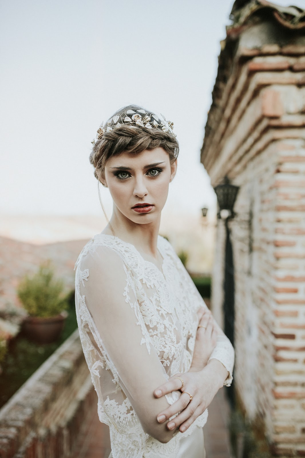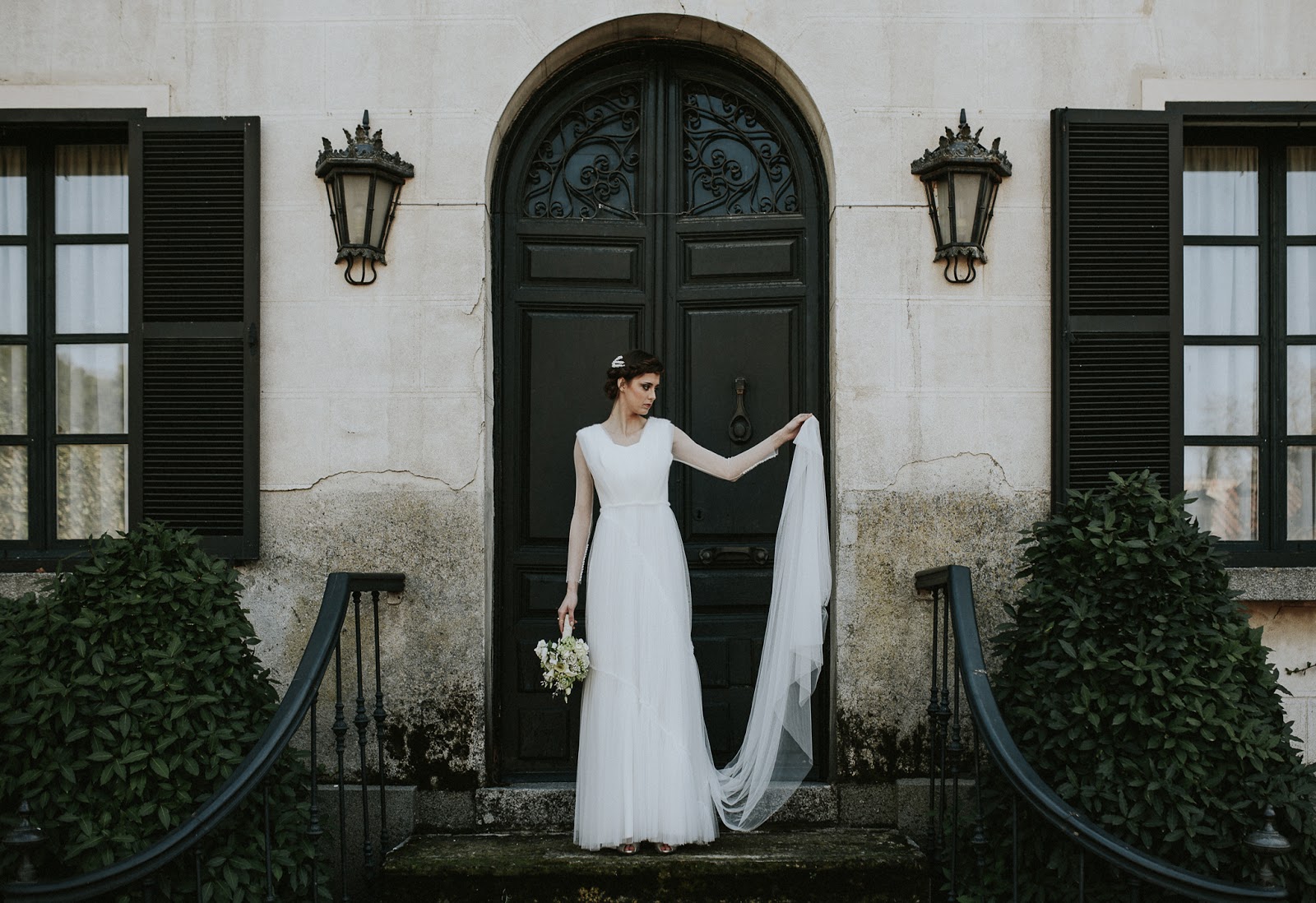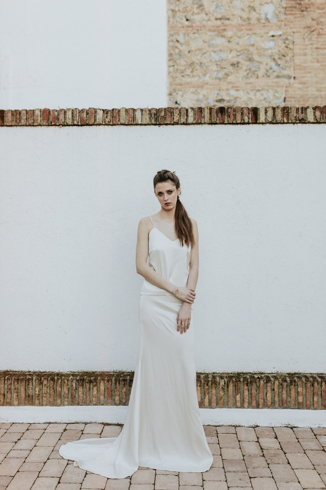 Caminando por los suelos empedrados destacan los zapatos de la firma Doriani, que junto a los tocados refinados y artesanales de Toussete, y a la firma de joyería Casilda Finat visten a una novia Impúribus de máxima sencillez y elegancia”