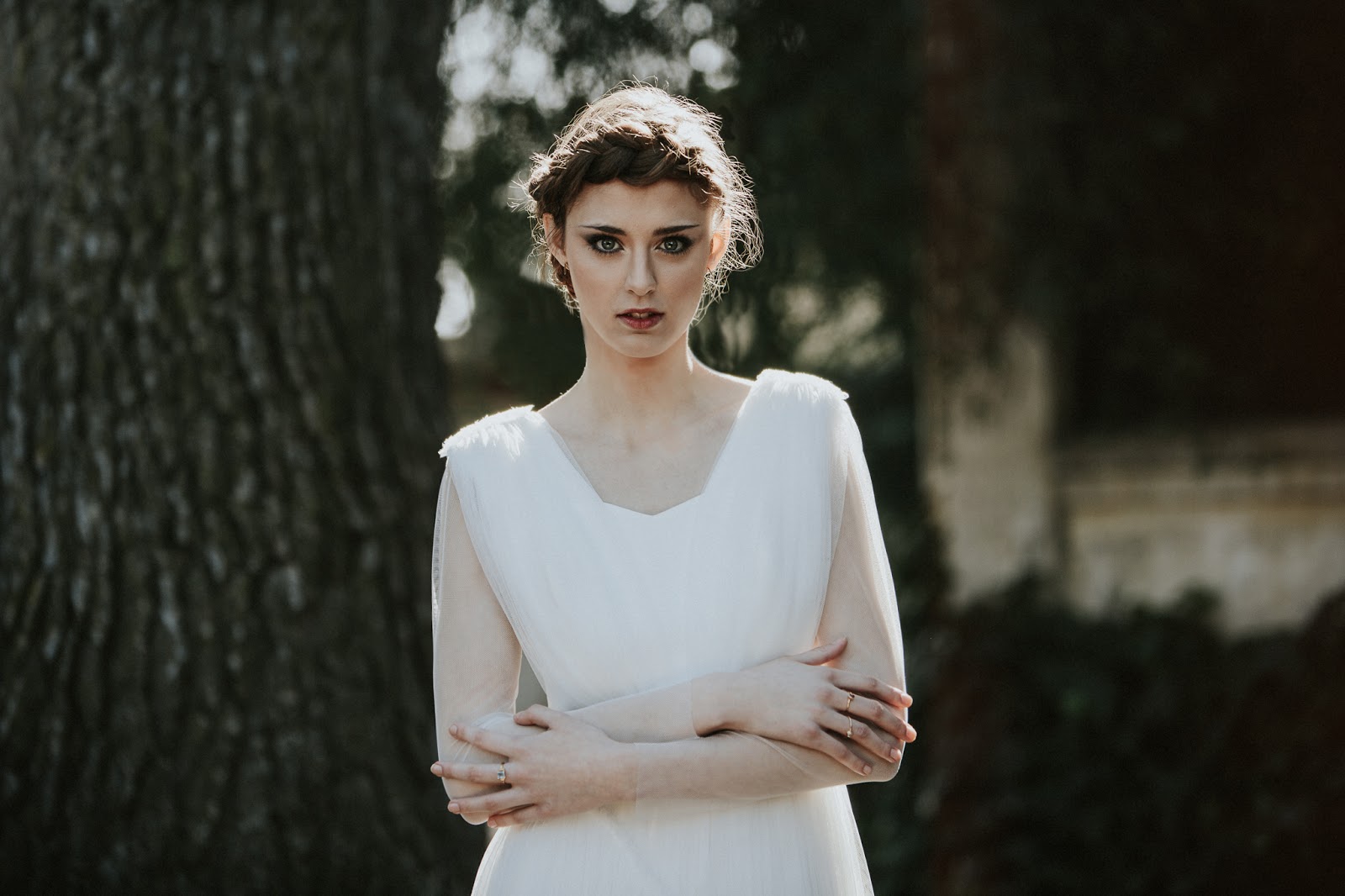 El Palacio de Negralejo y sus jardines reciben a la novia protagonista de este editorial organizado por Peonias Eventos y fotografiada con acierto por Prisma Blanco. Una novia inquietante, mística, salida de un bosque encantado.