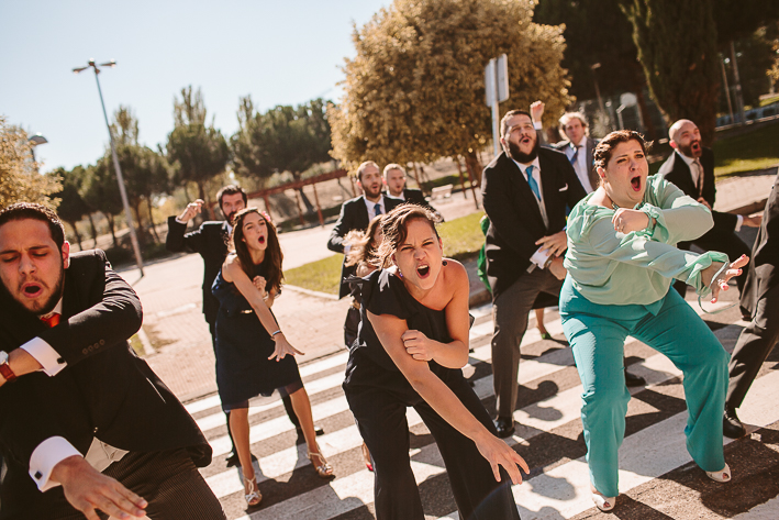 A la salida de la iglesia les esperaba una sorpresa por parte de los hermanos y los primos de Chema: un Haka Maori de Rugby. Según cuenta Particia: “Se quitaron las pamelas y cortaron el tráfico; llevaban ensayándolo muchos meses y fue una pasada!”