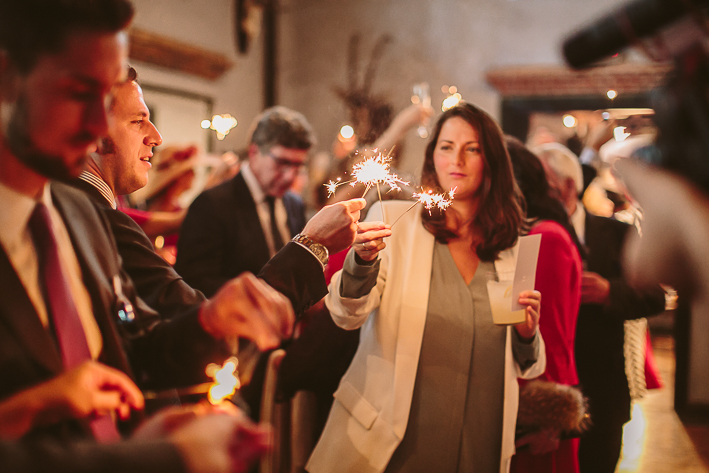 Los novios abrieron el baile con la canción Strangers in the Night de Frank Sinastra porque relata su historia de amor desde que se conocieron hace 10 años. Los invitados crearon un ambiente muy romántico con bengalas.