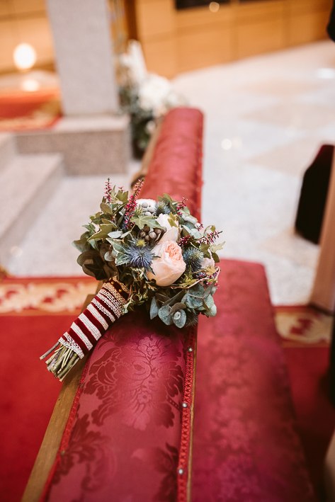 Patricia llevó un ramo de rosas, eucalipto, paniculata y brezo de la floristería Tiscar. Lo envolvió en un pañuelo centenario junto con una cinta de terciopelo color frambuesa a conjunto con sus zapatos y sus pendientes.